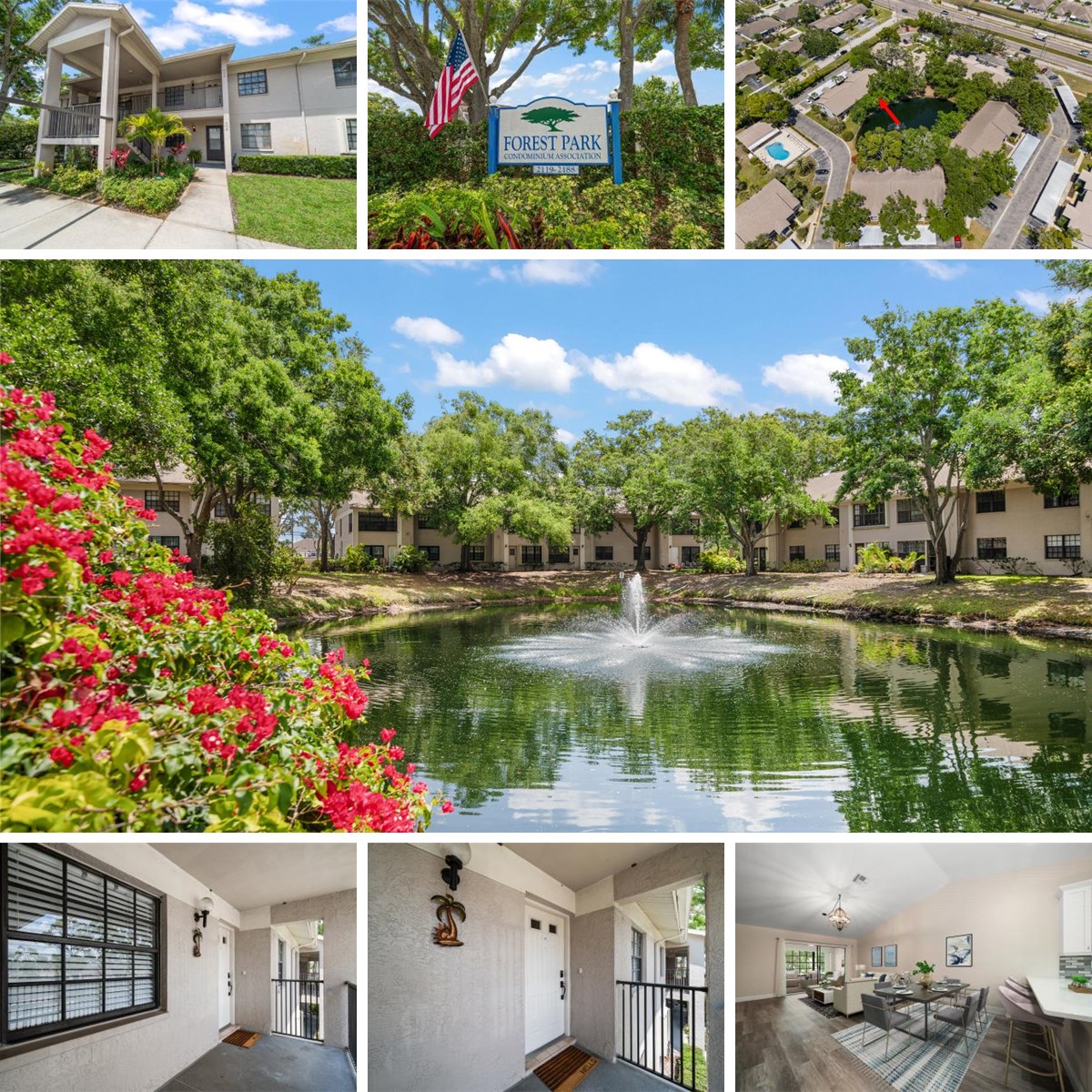 Completely Remodeled with NEW A/C & NEW HOT WATER TANK! At 63 feet above sea level, this home is NOT IN A FLOOD ZONE. Nestled within the serene community of Forest Park Condos in highly sought after Dunedin, this pristine, completely updated condo offers the perfect blend of luxury, comfort, and convenience. A meticulously maintained unit, this stunning condo boasts 2 bedrooms, and 2 baths, with assigned carport parking, soaring 12-foot vaulted ceilings, and an enclosed sunroom with tranquil and park-like lake views. Up the stairs to this 2nd floor unit you are met with a cozy space for outdoor seating on the front of the unit.